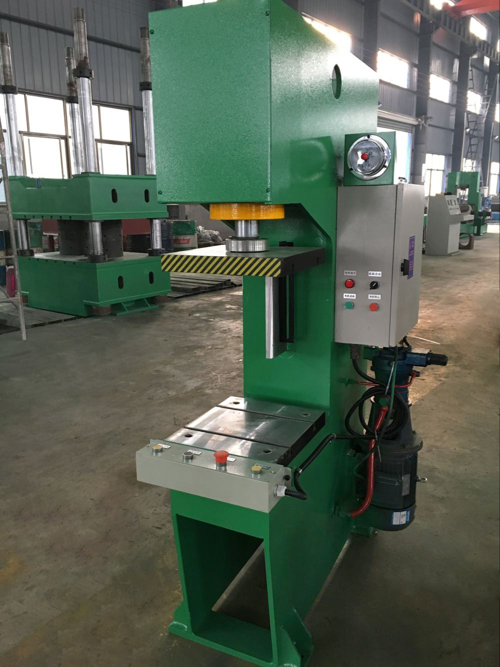 性能特點(diǎn):本系列單柱式液壓機(jī)通過(guò)計(jì)算機(jī)優(yōu)化直立式C型結(jié)構(gòu)設(shè)計(jì),剛性好,采用鋼板焊接,焊接后通過(guò)回火時(shí)效處理,確保機(jī)身永不變形。液壓系統(tǒng)安裝于機(jī)身內(nèi),外型美觀,結(jié)構(gòu)緊湊,操作方便。本系列液壓機(jī)設(shè)有獨(dú)立的液壓與電器控制系統(tǒng),采用按鈕集中控制,可實(shí)現(xiàn)定程和定壓兩種成型工藝,機(jī)器行程、壓力可在規(guī)定范圍內(nèi)調(diào)節(jié);本壓機(jī)壓頭采用四柱導(dǎo)向,具有抗偏載能力。